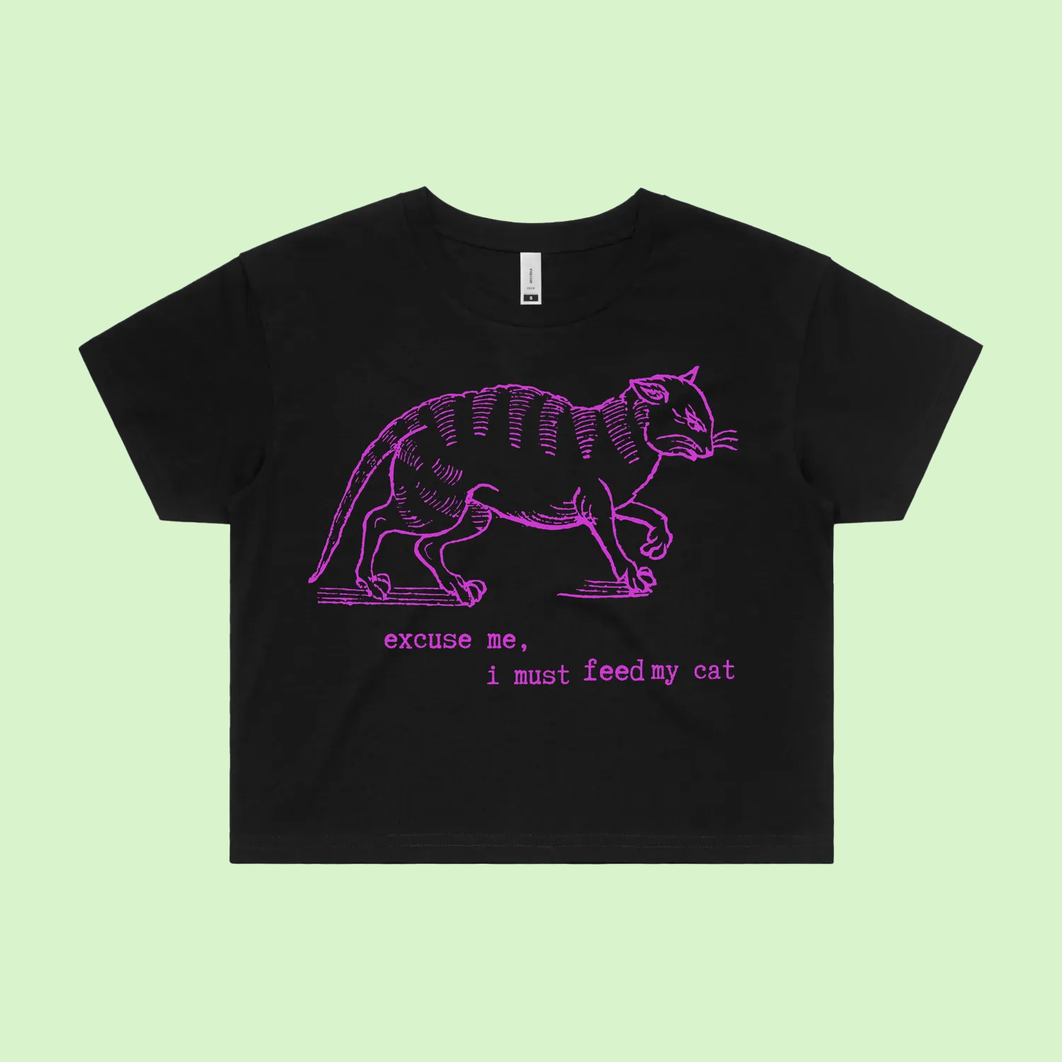 A soft, dry-humoured cat-lover tee featuring a medieval woodcut illustration of a very unimpressed feline and the phrase “excuse me. I must feed my cat.” Ideal for anyone who uses their cat as a legitimate exit strategy.